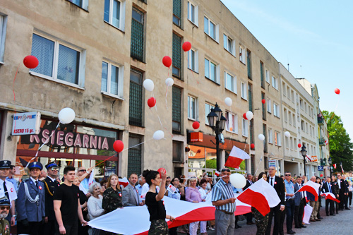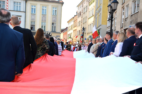 ogromną 20 metrową białoczerwoną flagą niesioną przez uczestników