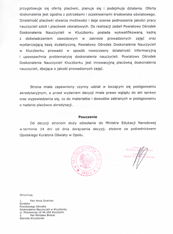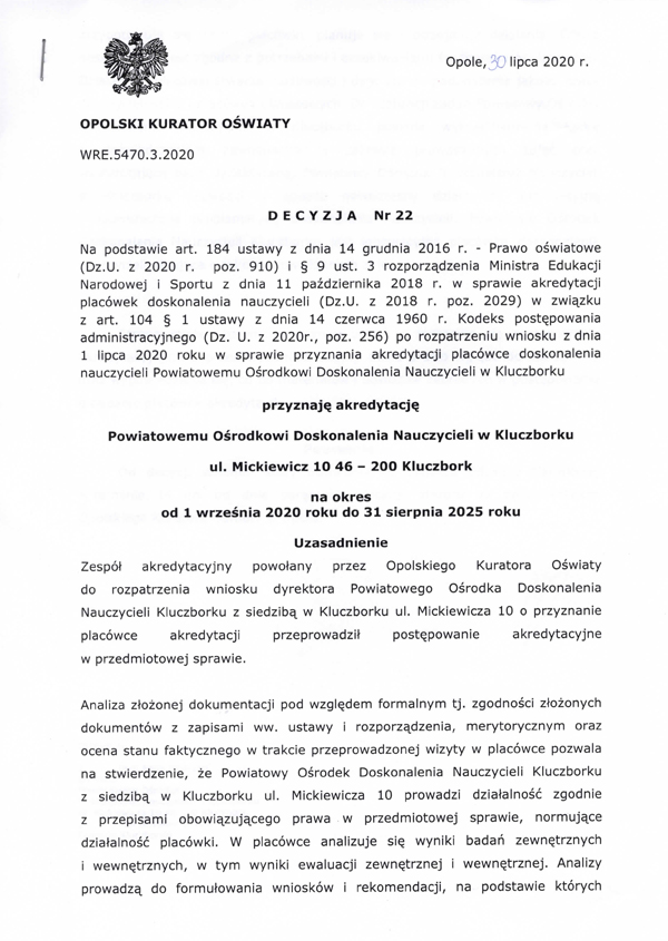 Powiatowy Ośrodek Doskonalenia Nauczycieli w Kluczborku uzyskał kolejną akredytację Opolskiego Kuratora Oświaty do 2025 roku. Akredytacja potwierdza, że Ośrodek prowadzi działalność zgodnie z obowiązującymi przepisami prawa, starając się o jak najwyższą jakość realizowanych zadań.