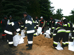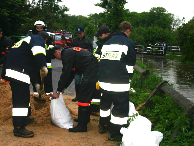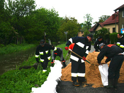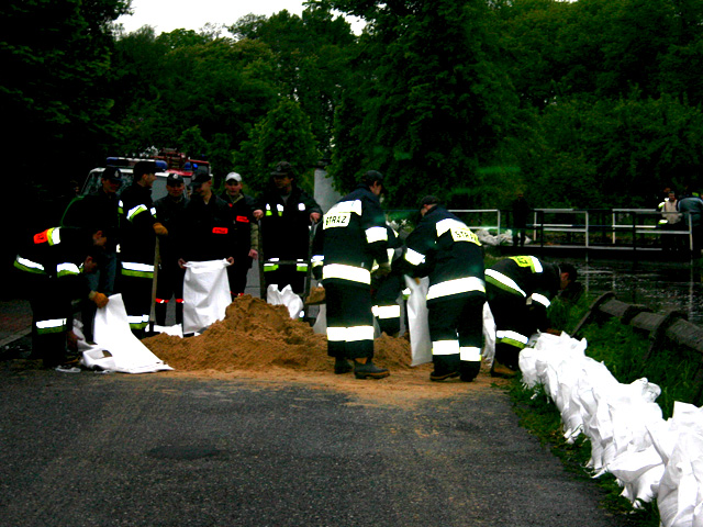 Strażacy układają worki z piaskiem wzdłuż Stobrawy na