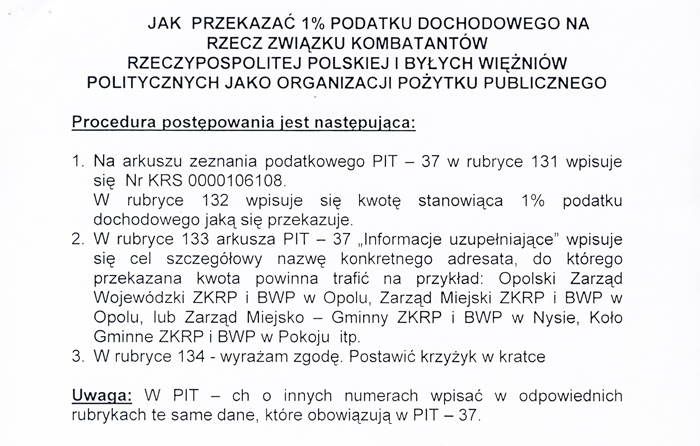 Więźniów Politycznych zachęca do przekazania odpisu 1% podatku za rok