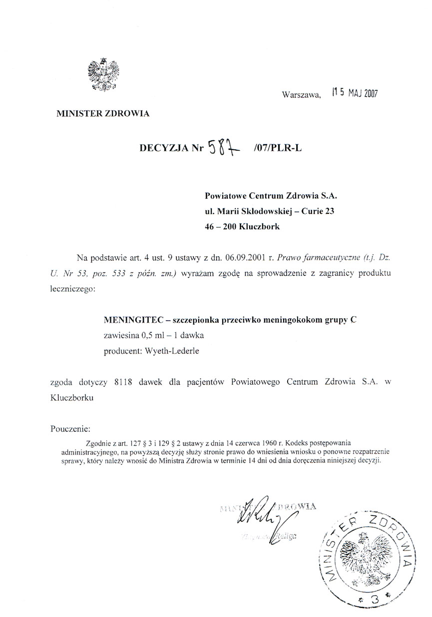 meningokokom może podjąć Minister Zdrowia w przypadku