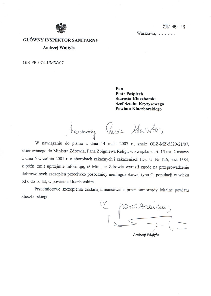 objęciu szczepieniem przeciwko meningokokom dzieci i personelu Powiatowego