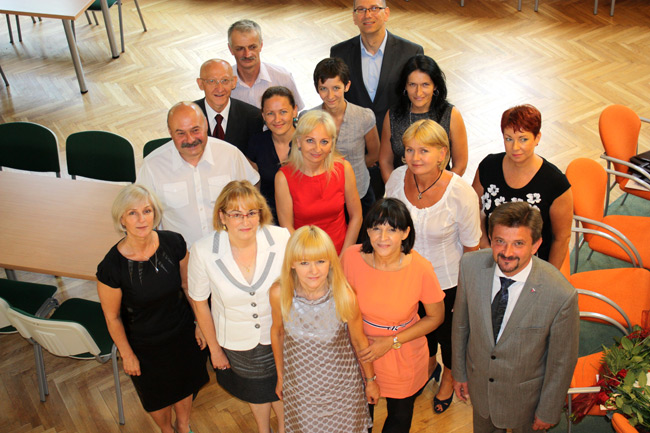 Na zdjęciu: Starosta Piotr Pośpiech wraz z dotychczasowymi i byłymi