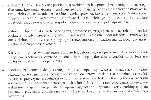 W związku z wejściem w życie z dniem 1 lipca 2014 r. przepisów zmieniających sposób i tryb wydawania kart parkingowych osobom niepełnosprawnym i placówkom zajmującym się opieką, rehabilitacją lub edukacją osób niepełnosprawnych zgodnie z ustawą z dnia 23 października 2013 r. o zmianie ustawy - Prawo o ruchu drogowym oraz niektórych innych ustaw (Dz.U.2014.486 z późn. zm.) Wydział Komunikacji i Transportu Starostwa Powiatowego w Kluczborku informuje, że: