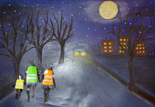 wymaga”. Praca Ani przedstawia rodzinę, która idzie asfaltową drogą,