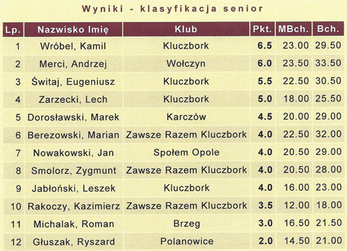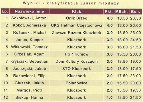 W rozegranym IV Wiosennym Turnieju Szachowym organizowanym przez Zespół Szkół Ponadgamnazjanych Nr 2 Centrum Kształcenia Ustawicznego w Kluczborku oraz Kluczborskiego Stowarzyszenia "Zawsze razem" wzięło udział 27 zawodników w wieku od 8-80 lat. Zwycięzcom gratulujemy i zapraszamy na następne turnieje.