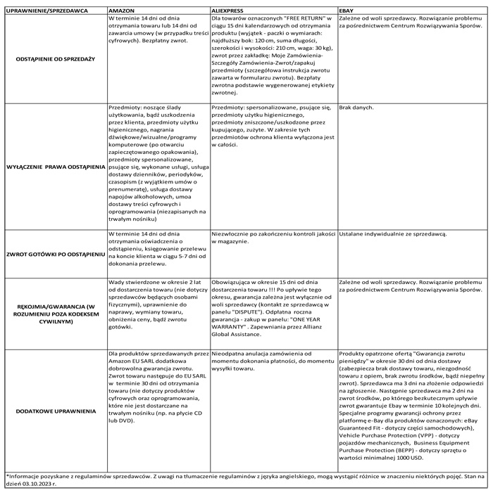 podstawie regulaminów sprzedawców zagranicznych, wedle stanu na dzień